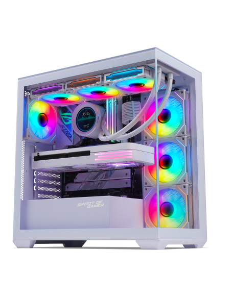 Ventilation et rétroéclairage RGB pour une ambiance de jeu intense. Dominez le refroidissement avec les 6 ventilateurs ARGB inclus de Spark, offrant jusqu'à 60 modes de rétroéclairage pour une personnalisation ultime. Il reste encore trois emplacements disponibles pour obtenir jusqu'à 9 ventilateurs au total, ce châssis garantit un flux d'air optimal et un rétroéclairage percutant. De plus, il est pleinement compatible avec les systèmes ARGR comme ASUS Aura et les autres marques de cartes-mères ARGB pour une synchronisation parfaite du rétroéclairage.